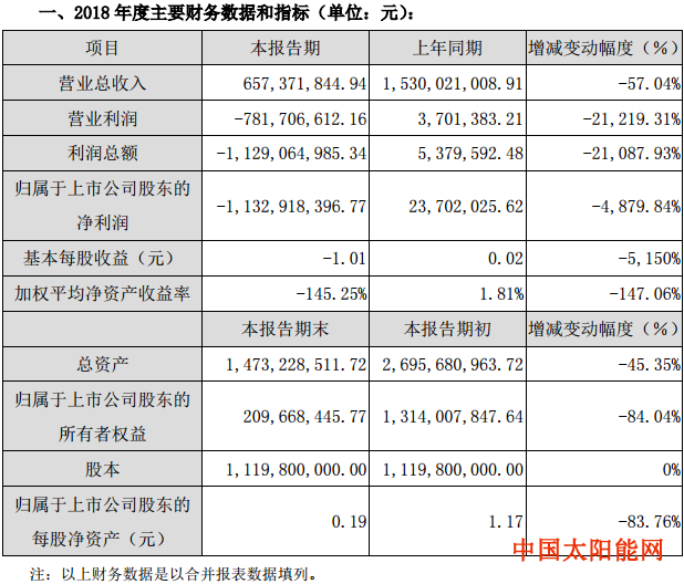 报告称,由于报告期内处置原子公司浙江优创光能科技有限公司,出售落后设备,发生巨额亏损等原因,导致公司2018年期末总资产1,473,228,511.72元,同比下降45.35%;归属于上市公司股东的所有者权益209,668,445.77元,同比下降84.04%;归属于上市公司股东的每股净资产0.19元,同比下降83.76%。