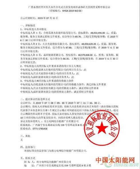7月8日,广西东盟经开区科天水性分布式光伏发电项目晶体硅光伏组件采购公示中标候选人,晶澳、天合、晶科依次为前三名候选人,具体如下: