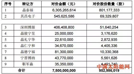 据公告,公司就购买晶澳太阳能100%股权需支付的交易总对价初步商定为750,000万元,全部由公司以新增股份方式支付。就转让晶澳太阳能100%股权的交易行为,每一转让方各自可获得预估交易对价具体如下: